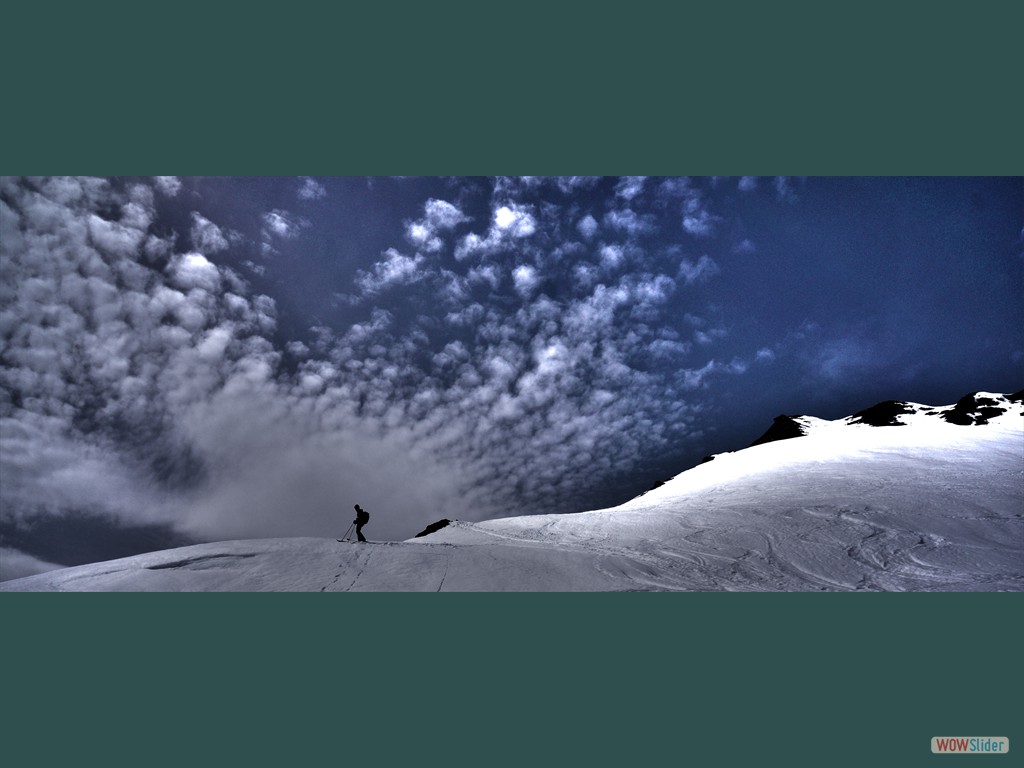 Direkt unterhalb des Gipfels bewegt man sich parallel unter einer gigantischen Wechte, das lässt sich allerdings kaum vermeiden.